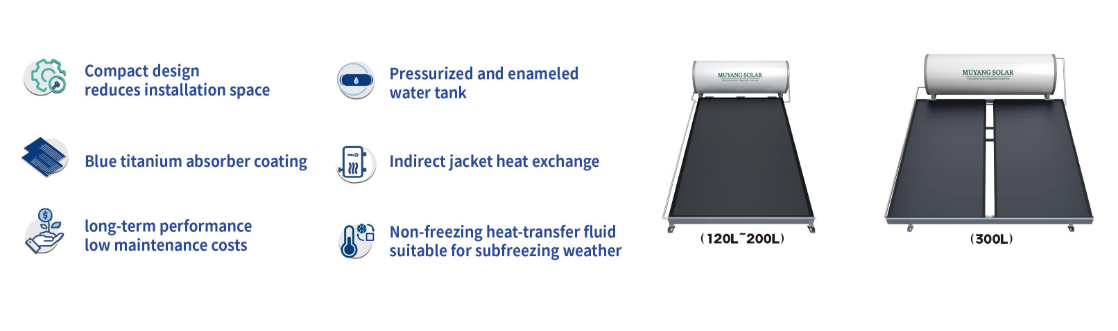 Pressurized and enameled water tank with about 50mm polyurethane foaming insulation covering. The water tank vary depending on the size of the home, the number of solar collectors, and the amount of hot water needed in the home.