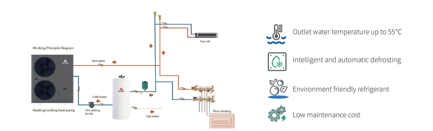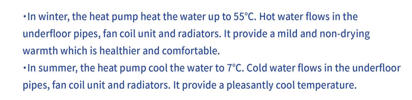 Product Model 3P 5P 6P 5P 6P 8P 10P 12P 15P Efficiency Class Class 1 Inverter/Fixed Frequency DC inverter Heating And Cooling Heat Pump Unit Power Supply 220V-240~/50Hz 380V-415 3N~/50Hz Refrigerant R410a Max Heating Water Temp(℃) 55℃ Dry-bulb temp 7℃
