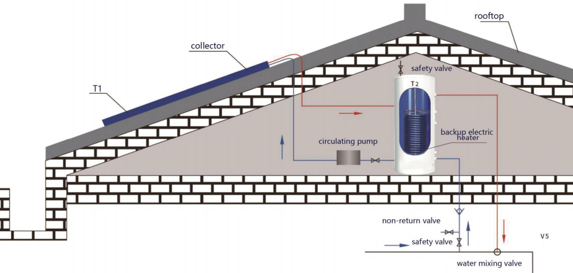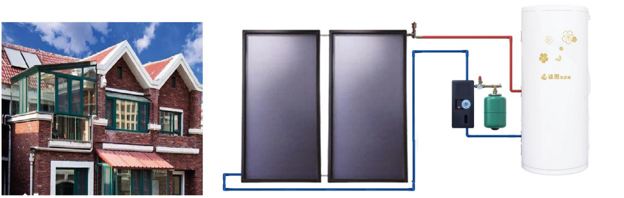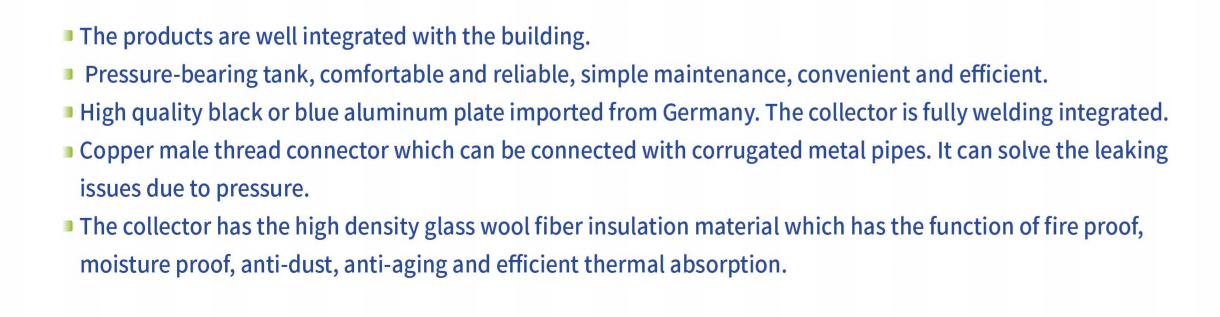 Model Collector type Collector size(mm) Tank size(mm) Collector area Tank volume(L) Electric heater power Tilt angle Power supply MY-150L flat panel 2000*800*80*2 φ480mm*1385mm 3.2m² 150L 3KW According to the roof pitch 220V MY-200L flat panel 2000*1000*80*2 φ580mm*1290mm 4.0m² 200L 3KW 220V MY-300L flat panel 2000*1000*80*3 φ650mm*1540mm 6.0m² 300L 3KW 220V